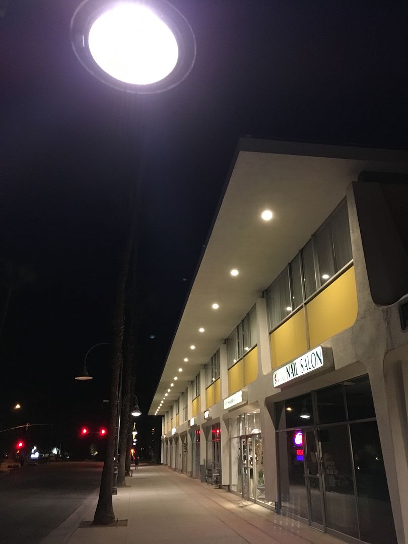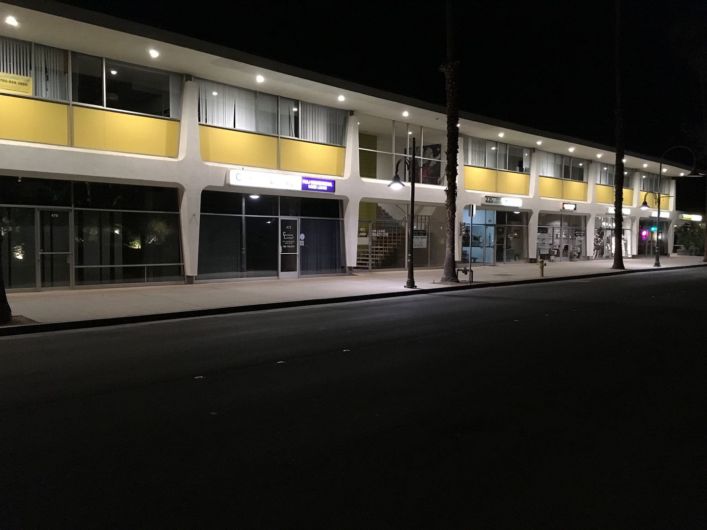 the striking contrast of a deep dark night and the outspoke clean white, yellow street mall.